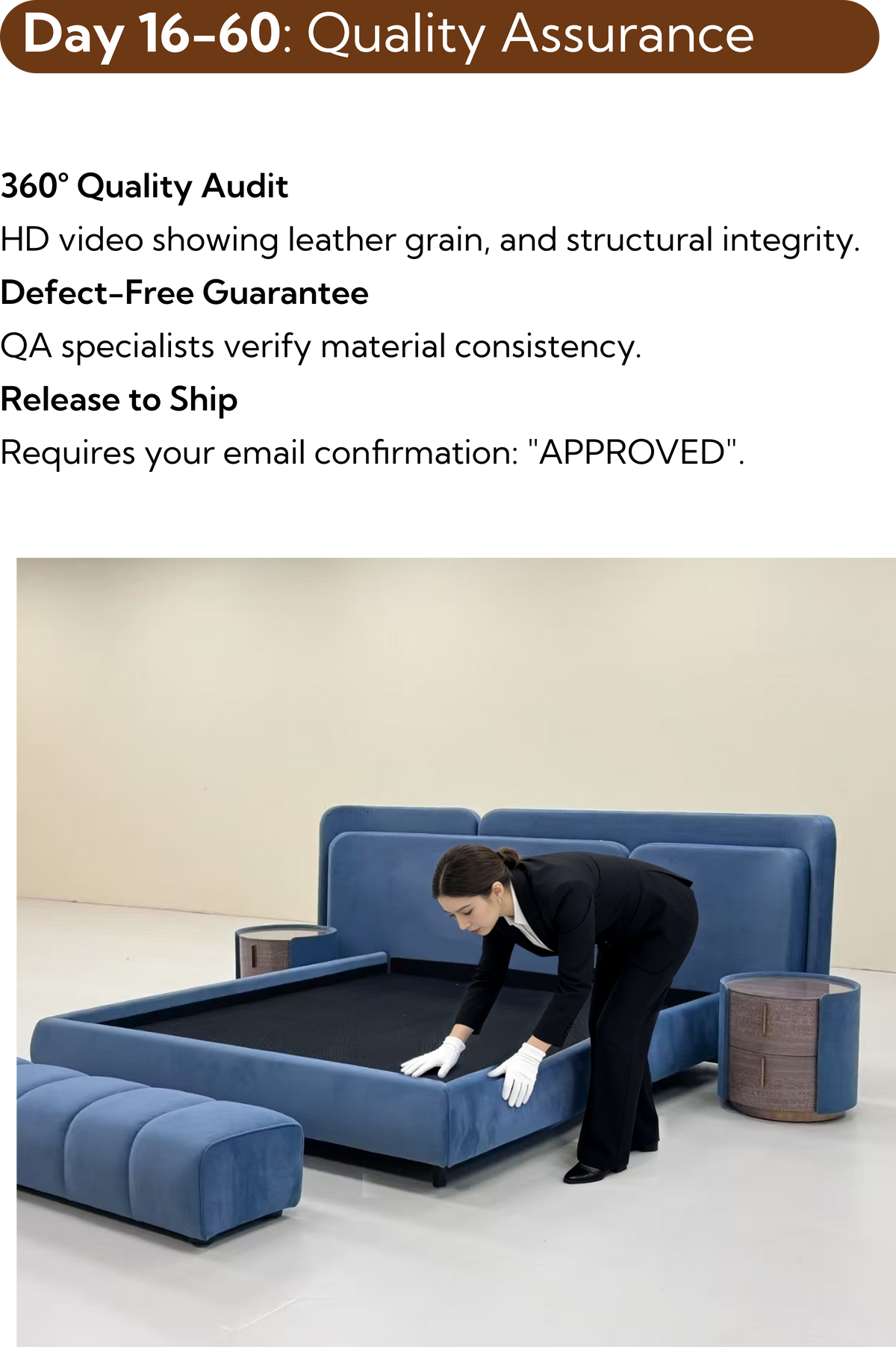 Every piece is meticulously handcrafted to order, ensuring it's uniquely yours. This bespoke process takes approximately 8 weeks. After completion, your furniture embarks on its journey across the ocean, arriving safely in the US about 4 weeks. Tracking information will be sent to you as soon as your order leaves our warehouse.