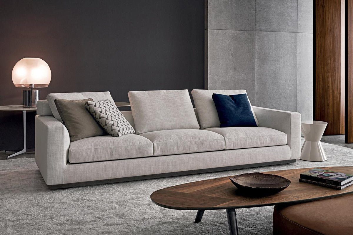 The Linea Sofa defines modern elegance through the purity of its form. Its base floats just above the floor, creating clean, uninterrupted lines that emphasize a refined and versatile silhouette. This foundational simplicity makes it a perfect canvas for personal expression, harmonizing effortlessly with a wide range of premium fabrics or leathers. Upholstered in a soft, neutral tone and accentuated by contrasting cushions, it exudes a calm and collected presence. Designed to be both a statement piece and a serene haven, the Linea Sofa seamlessly integrates into any setting, offering a perfect balance of measured style and enduring comfort.