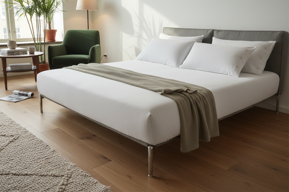 The Oasis Bed transforms the bedroom into a sanctuary of serene comfort, defined by its generous, upholstered headboard that invites deep relaxation. This central element, composed of two plush cushions filled with sterilized goose down, creates a sumptuous backdrop for rest. Its clean silhouette is accentuated by elegant piping and unique horizontal stitching, adding a refined detail that highlights the design's tailored craftsmanship. Contrasting with the soft upholstery, a sleek metal base with refined cast metal feet provides a foundation of modern stability and lightness. The Oasis Bed masterfully balances substantial comfort with airy elegance, making it the perfect centerpiece for a peaceful and stylish retreat.